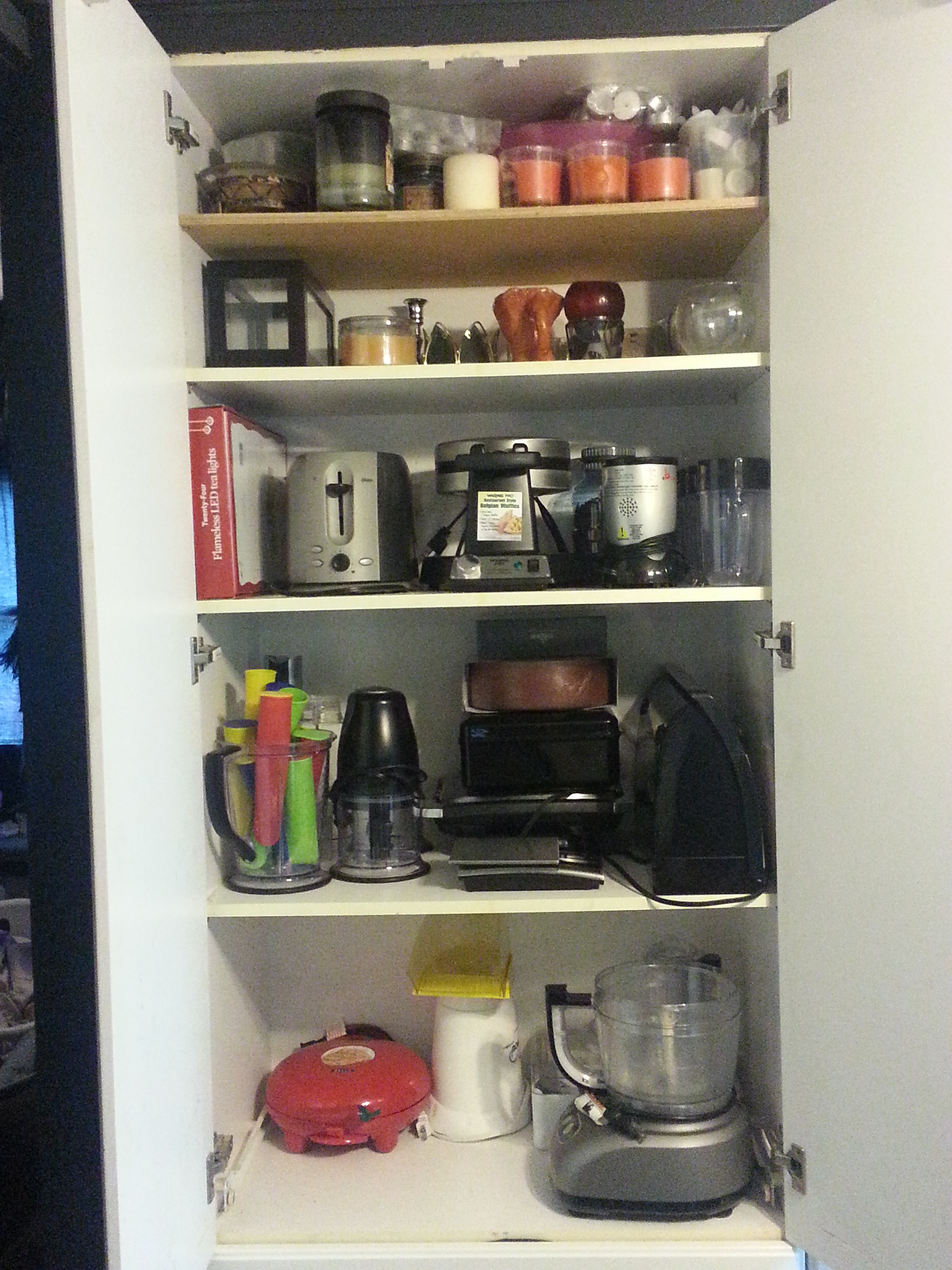 This is my food pantry. I am extremely lucky to have an incredible kitchen with LOTS of floor to ceiling cabinets for storage. However, I have almost no counter space as a result. Like every kitchen, I have so many things that I would differently redo in it if I could rip it all out and start all over again.