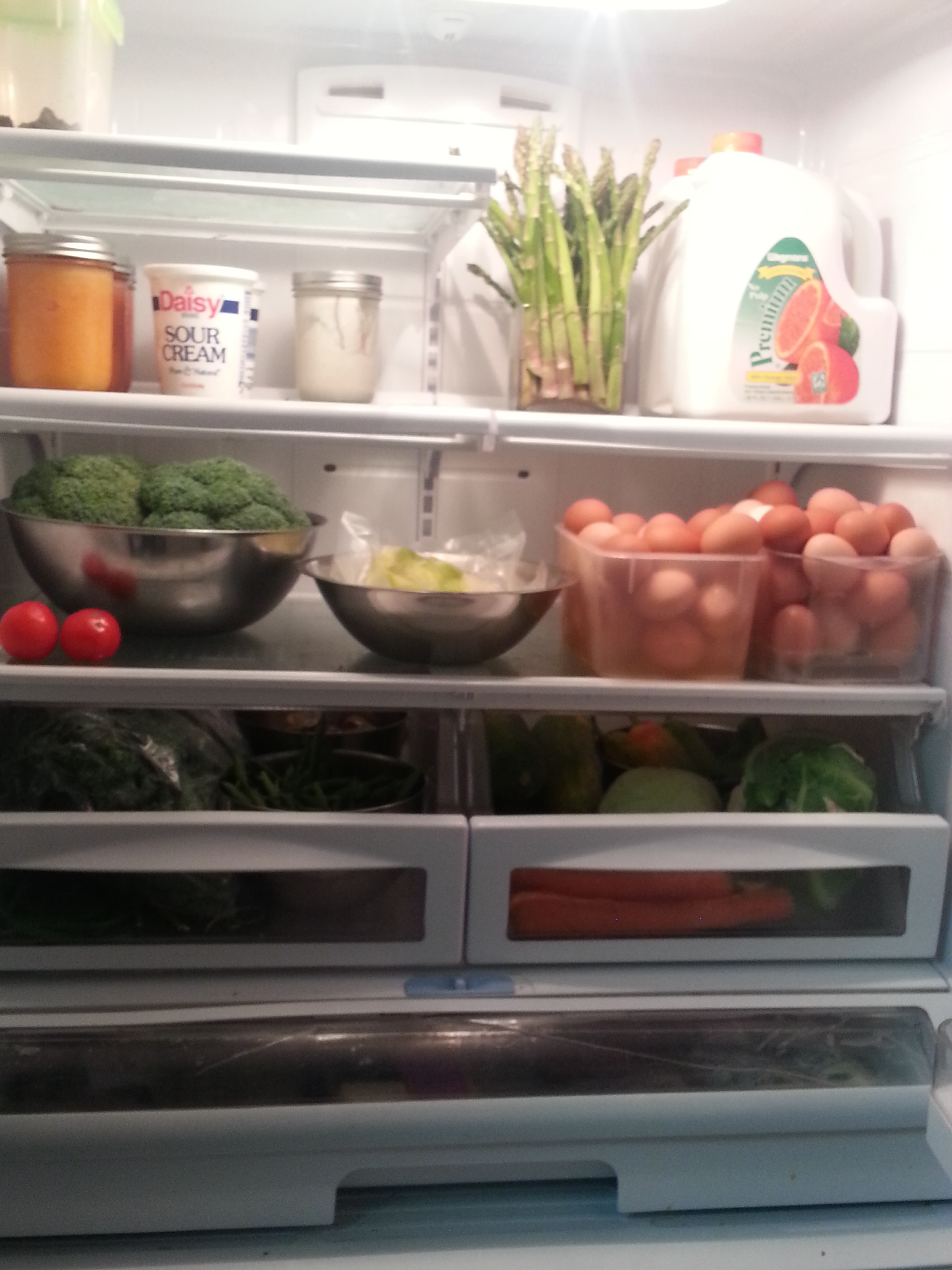 When I tell people we do not buy or eat hardly anything processed, I see the wheels turning in their heads. How is that possible? I then explain that noodles, certain cereals I allow my kids to eat (they are kids after all), and tortillas are what we now consider processed foods in my home. Our processed foods have about 5 ingredients in them max. The best part is that I not only can pronounce those ingredients, but I actually know what they are! They are instantly calling BULLSHIT. Since I believe that pics speak louder then words….Here is my pantry, fridge, freezer, my fruit and veggie buckets on my island, my herbs and spices, and my root crop drawer. Oh, I almost forgot to mention that this is 2 days into a 7 day menu for us.