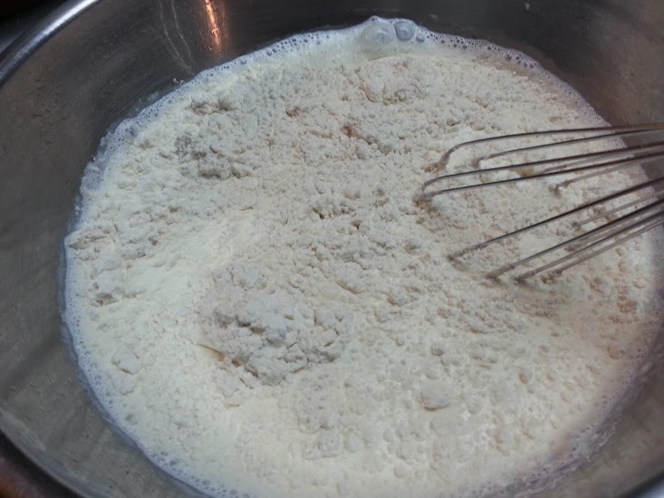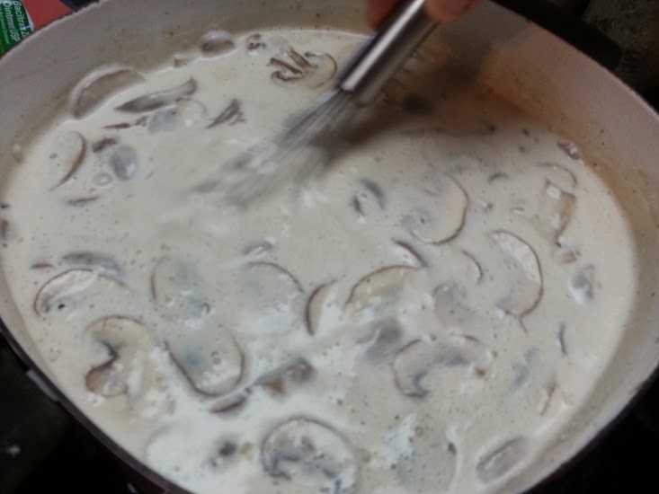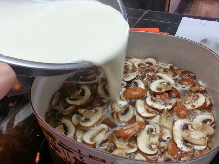 While the mushrooms are simmering with the garlic and onion or shallot, pour the cream in the bowl and add the flour.