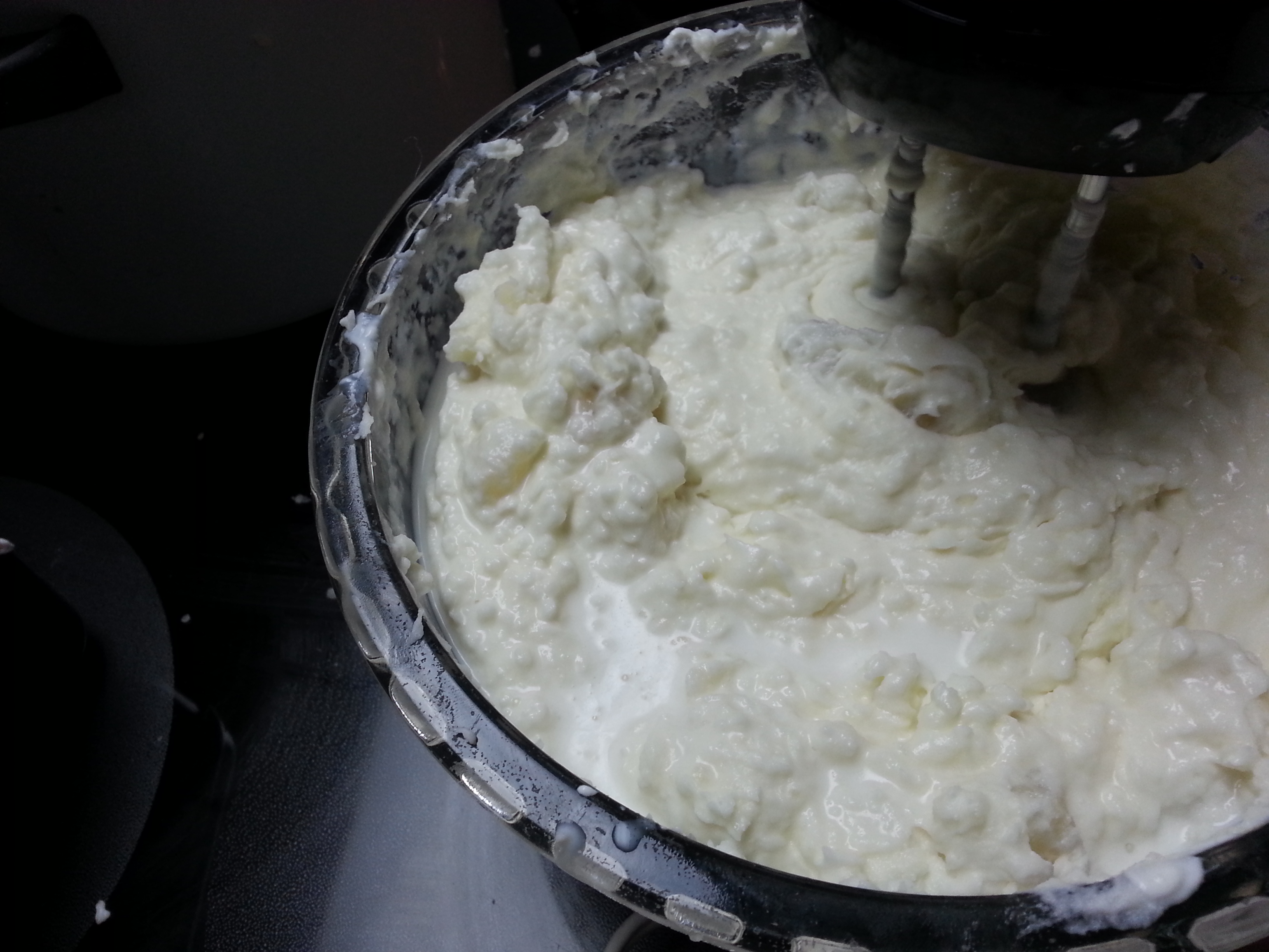 Once the potatoes are done, drain the water and add the sour cream, butter, 1/2 of the cheese and milk to the potatoes. Mix until blended with the mixer.