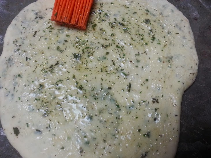 Add garlic, salt, pepper, parsley, dill and cilantro to the dough.