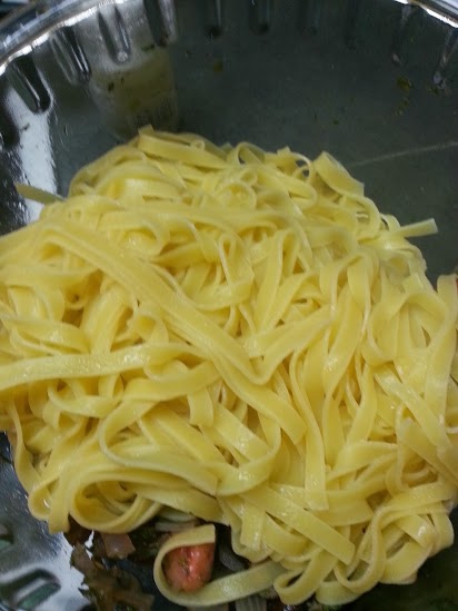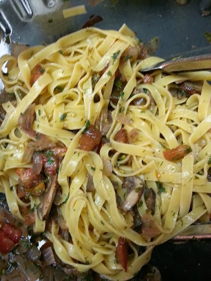 Once the noodles, mushrooms, and shallot or onion are cooked, add them to the bowl with the tomato and seasonings. Toss until blended together.