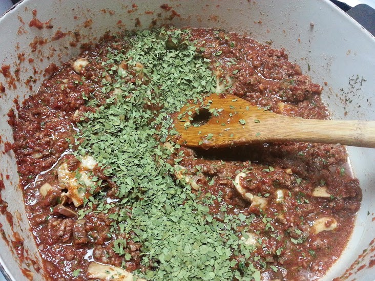 Add the tomato starter and seasonings (to taste) to the browned hamburger. If you are not used to cooking with sage, a word of advice, a little can go a long way!
