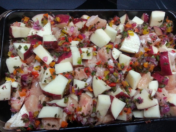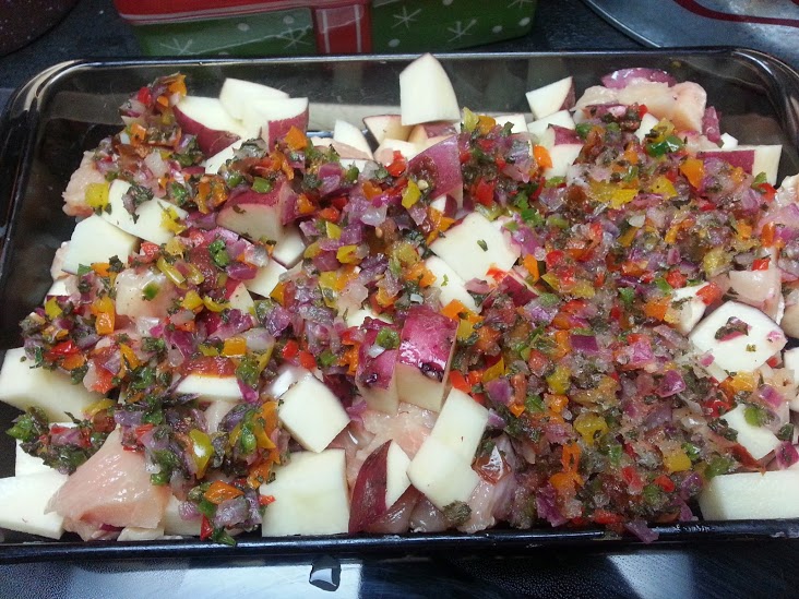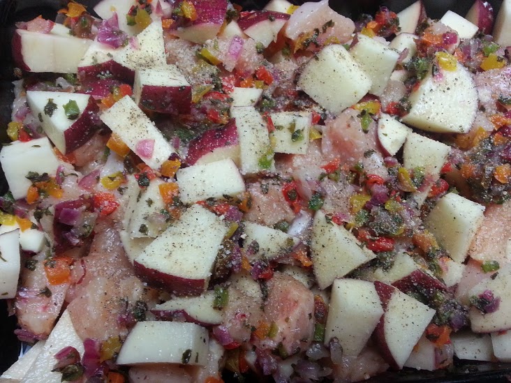 Bake at 425 until chicken is fully cooked and the potatoes easily tear apart.