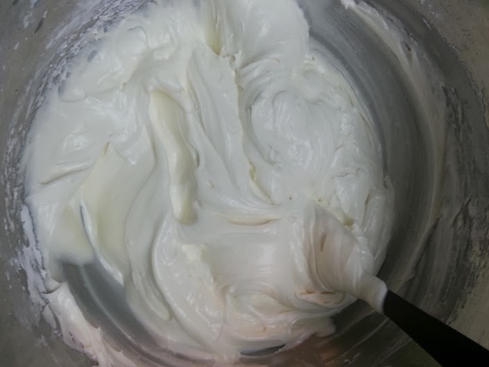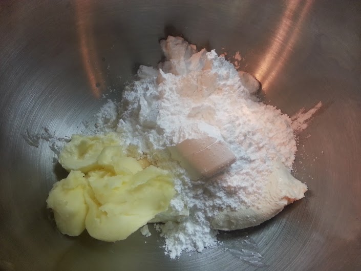 Blend everything in the mixer until a smooth icing is achieved. Some people will add in the powdered sugar a little bit at a time to avoid a puff of white powder. I of course am a baking rebel! I throw it all together and just turn on the mixer, on low, until it is blended enough to stop the huge poof of white powdery goodness, then turn it up to a higher setting. The choice is yours.