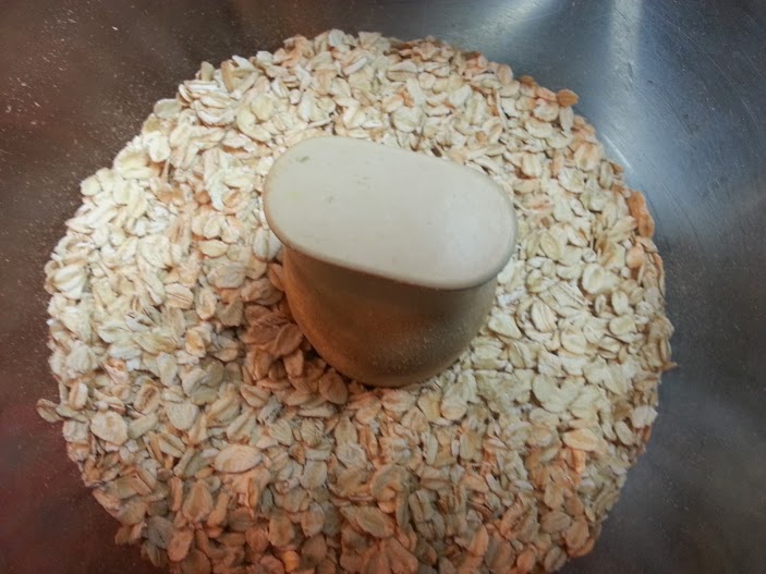 Put the oats, seed and nut mix in the blender and blend until you get the consistency you want. My 4 year old decided that ours was going to be ground into oblivion (flour like consistency) and place in a mixing bowl.