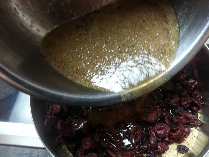 Add the liquid to the oat mix. You can’t call it a granola mix yet.