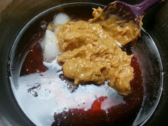 In a pot add the maple syrup, the vanilla extract, peanut butter and oil. Heat on med until blended and a slight foam appears on the top. Whisk often to prevent burning.