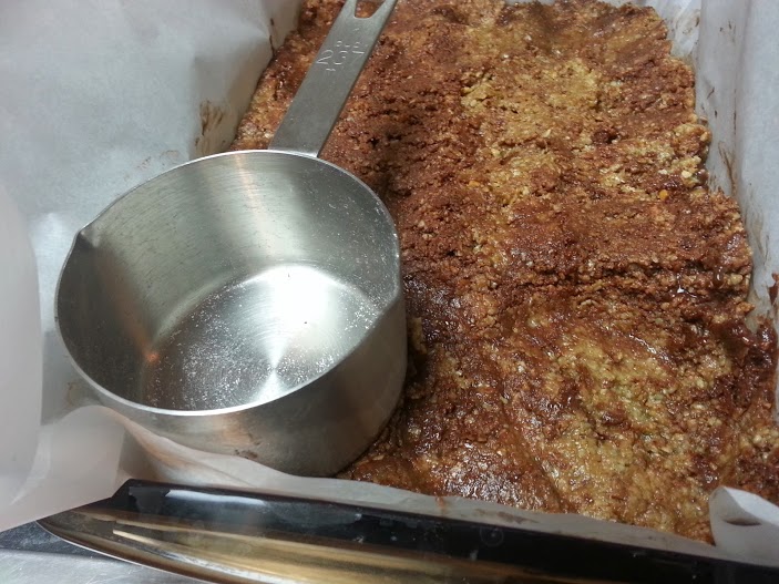 Once you get the mix in the baking dish, you need to get it to flatten out as much as possible and to also compress as much as possible. We used the bottom of my measuring cup to REALLY push down the granola mix. But you can use what ever you have on hand. Some people use cups, bowls, plates, etc.
