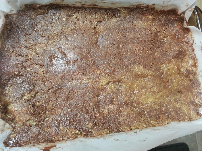 Stick it in the fridge for several hours. Minimum of 4-5 hours. Just like the other recipe, I still like to make things like this at night. I send the kids to bed when it gets put in the fridge. It gives the granola a fighting chance of surviving until it is “set”!