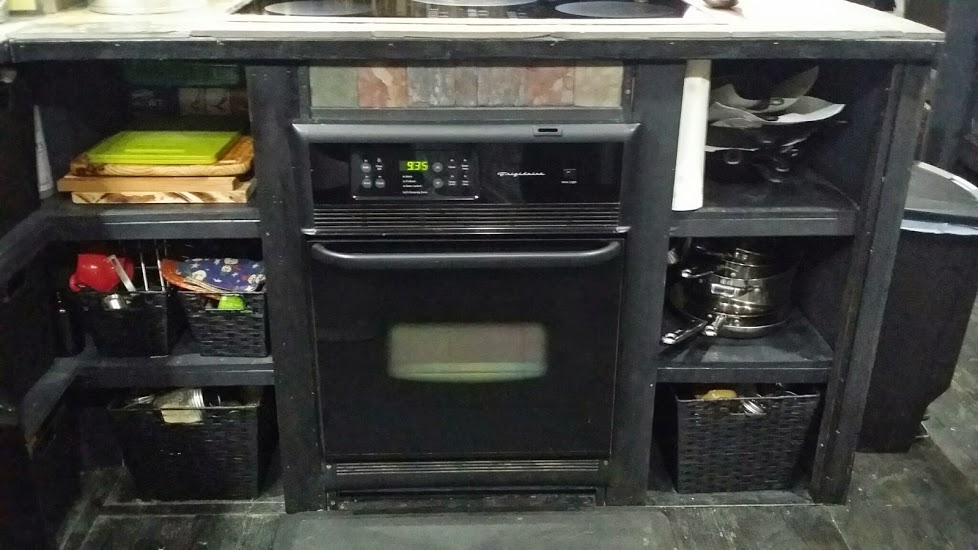 This is my wall oven and open shelves that surround it. My induction top cook top sits above it. My spices are in 4 baskets in the lowest shelves.