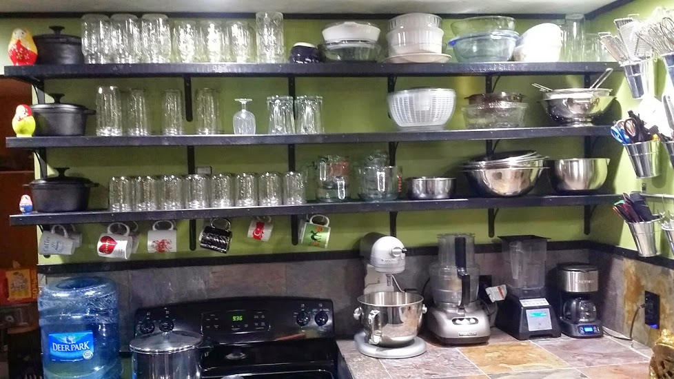 The basic concept for this kitchen design was to be open. I did not want cabinets or drawers. I instead opted for open shelves, baskets and buckets to organize my things.