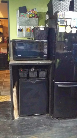 This area houses our microwave, and also my youngest’s helping baskets and her mini fridge. She has sensory issues and we are currently having her tested for Autism. I got tired of constantly battling her in regards to eating. She eats more often than we do. The fridge houses healthy snacks and drinks for her that she can get on her own. Eliminating all the food drama we were going through. She has her independence, I know what she is eating, and now she will even eat her regular meals  with us.