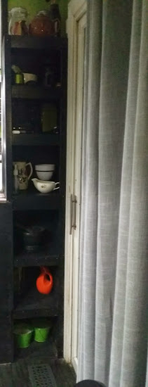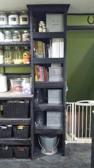 Floor to ceiling shelves that hide the long hole we found that extends from the floor to the ceiling.This area holds my cook books, vases, and medical stuff like band aids etc.