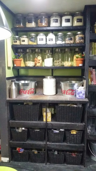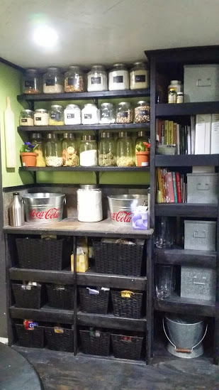 This is my pantry. Yes, all of it. No, I am not kidding. I do have a section in my basement for all my batch foods that we can.. Remember, we don’t eat processed foods. I LOVE LOVE LOVE my Coca-Cola bins. The hold all our fresh fruit and veggies that we snack on. I bought glass containers and choose to use chalkboard labels to help us know what is them. The lower half is baskets for all our other pantry items. One basket holds my baking supplies like sprinkles, raw sugar, extracts etc. Another basket holds our homemade dried fruits and snacks. Even our towels are in here. I kept everything simple and open.