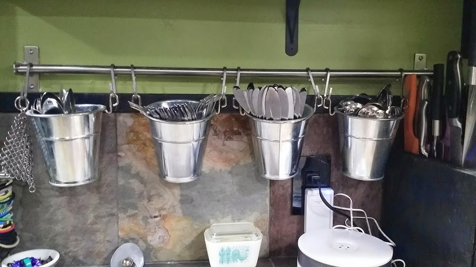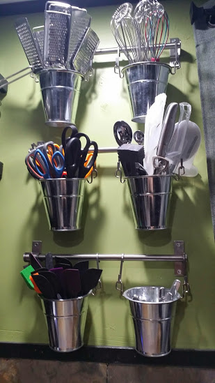 This is on my wall. I love it.  Each bucket organizes my stuff perfectly for me. From scissors to scoops, to spatulas, to whisks, to shredders and finally to hodgepodge stuff that gets used regularly….