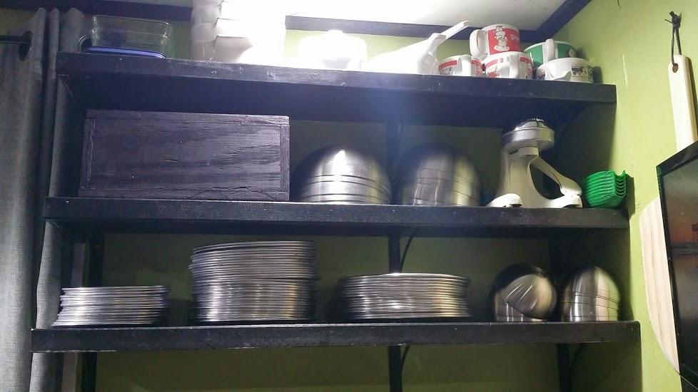 Here is the main set of shelves that house all my mixing bowl, baking / serving bowls, to all our glasses. I choose to use mason jars for our glasses as they also double as my preferred food storage for left overs. This saved on space for us BIG time….