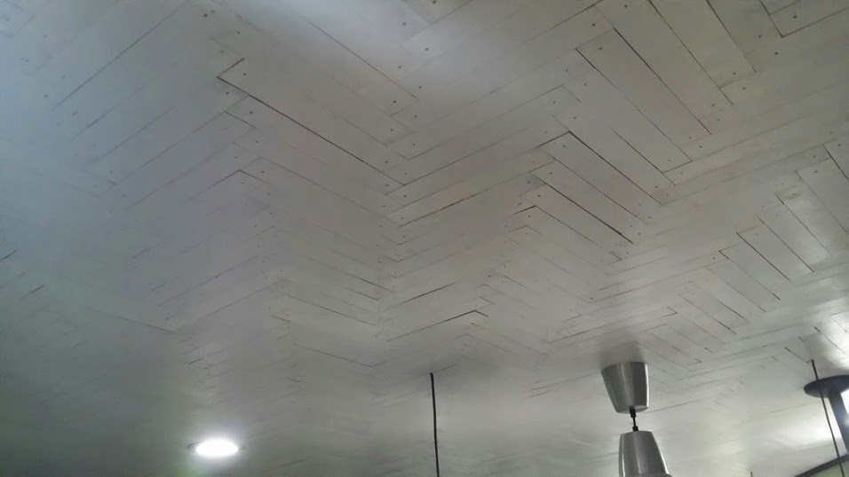 Chevron pattern on the ceiling. This took us 4 days to put up. Those 4 days did not include all the cutting, sanding, or painting. There is about 3000 nails in my ceiling (give or take 1 or 2).