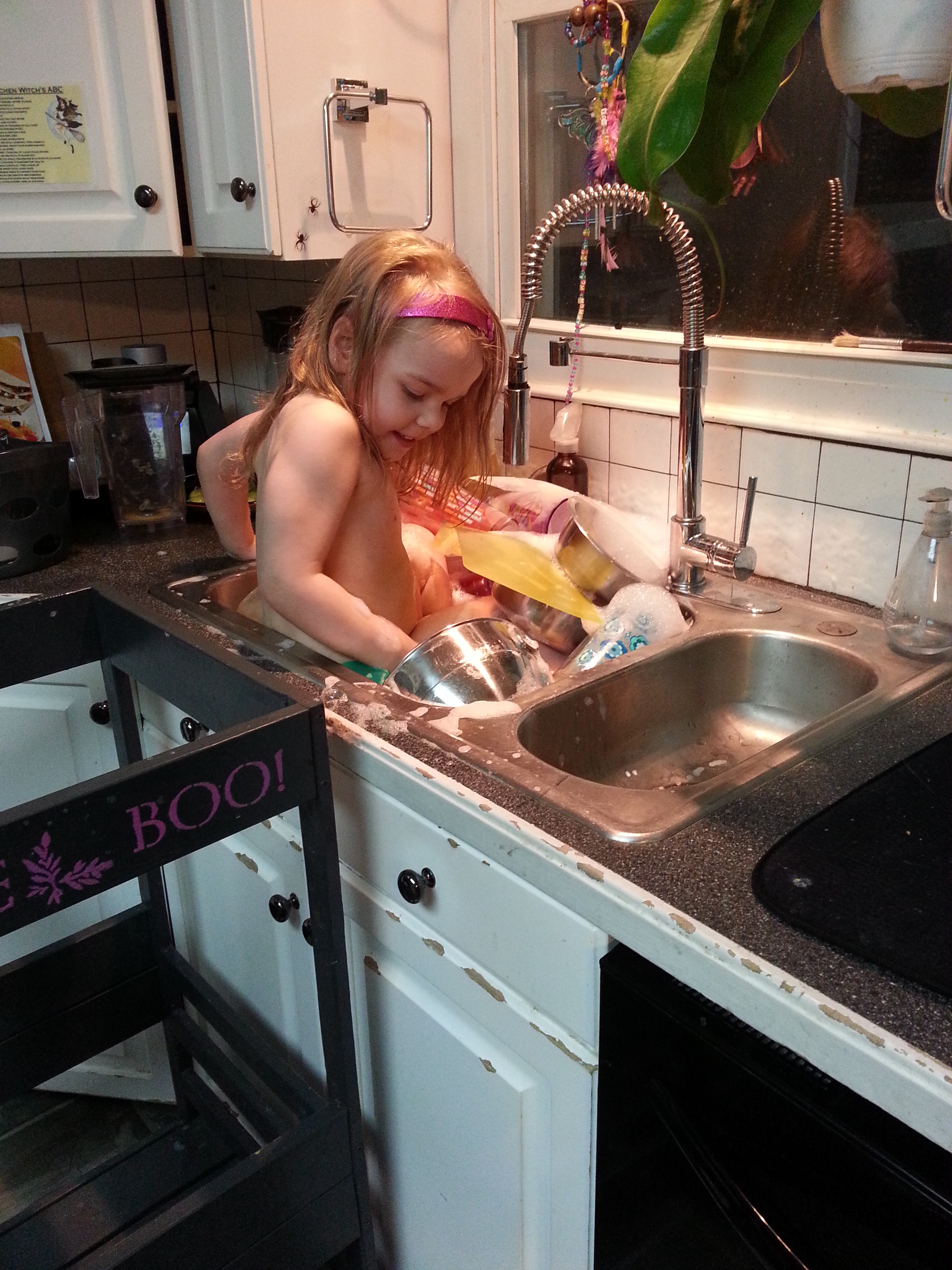 Sink Before. My youngest decided to first wash the dishes. Then decided to jump into the sink and wash them that way....